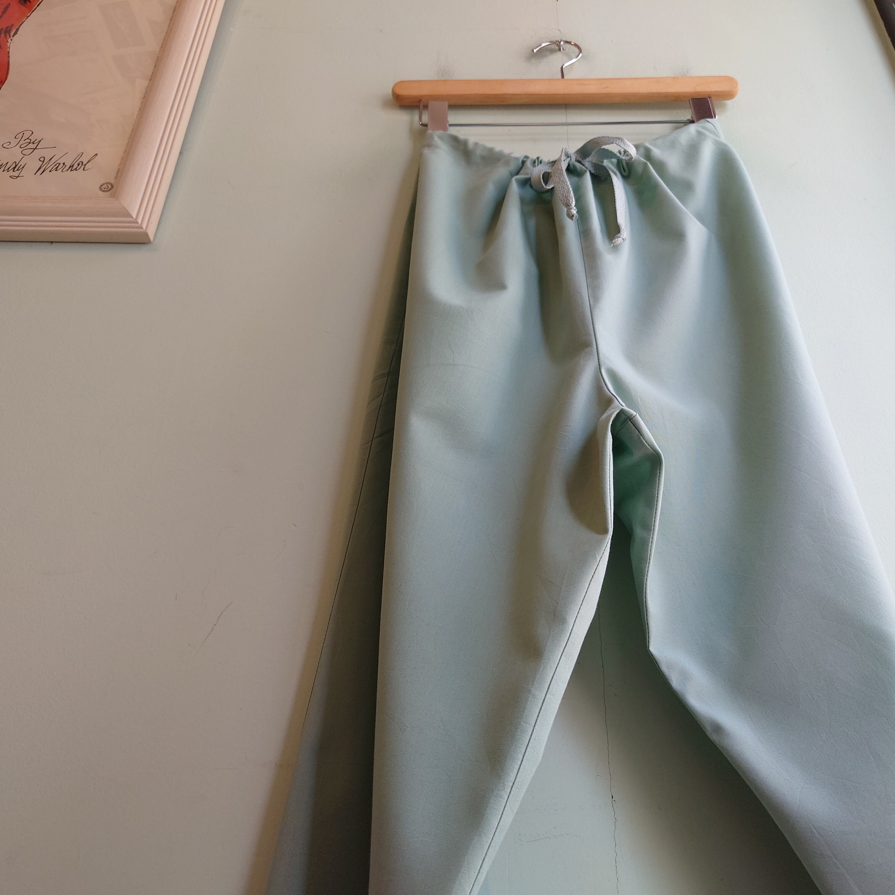 ★スクラブならではの極薄素材のワイドシルエットを、紐で絞り込んでイージーパンツのように履くUSA古着のメディカルパンツ。こちらはミントグリーンのレアカラー。