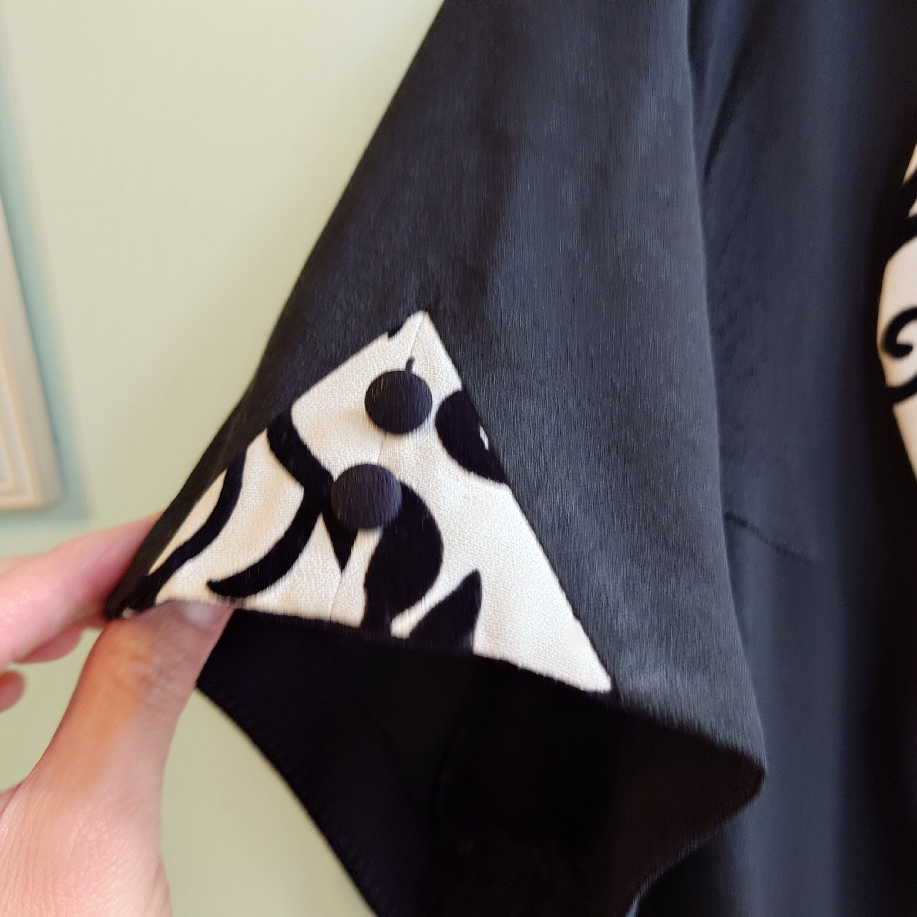 ★モーニングのスーツをワンピースに仕立て直したような、独創的デザインのヴィンテージドレス。白地の切り替えにはフロッキー系素材のボタニカル柄。襟元のあて布を外せばジャケット風にも着られるので、夏場の羽織にも◎。
