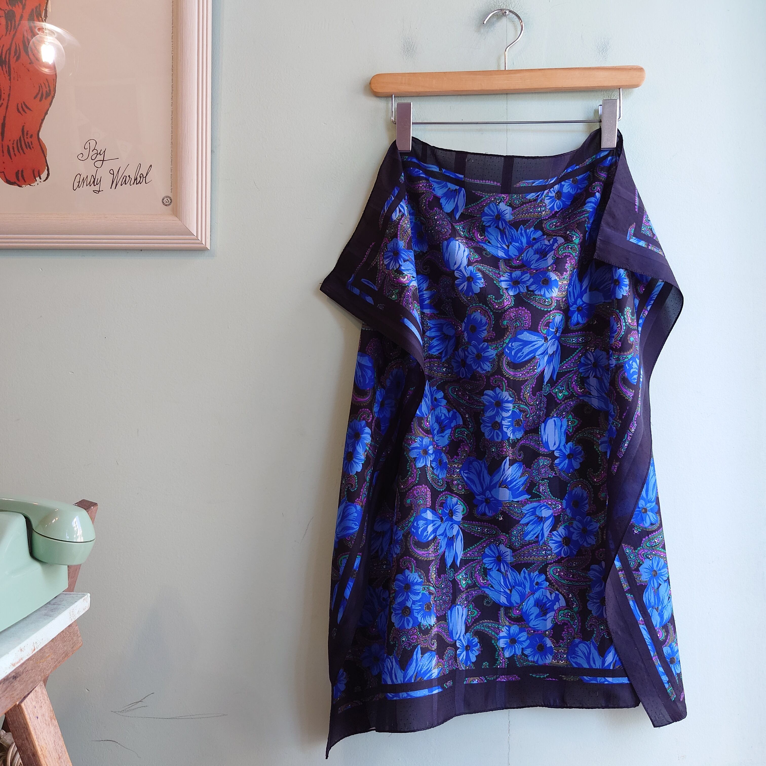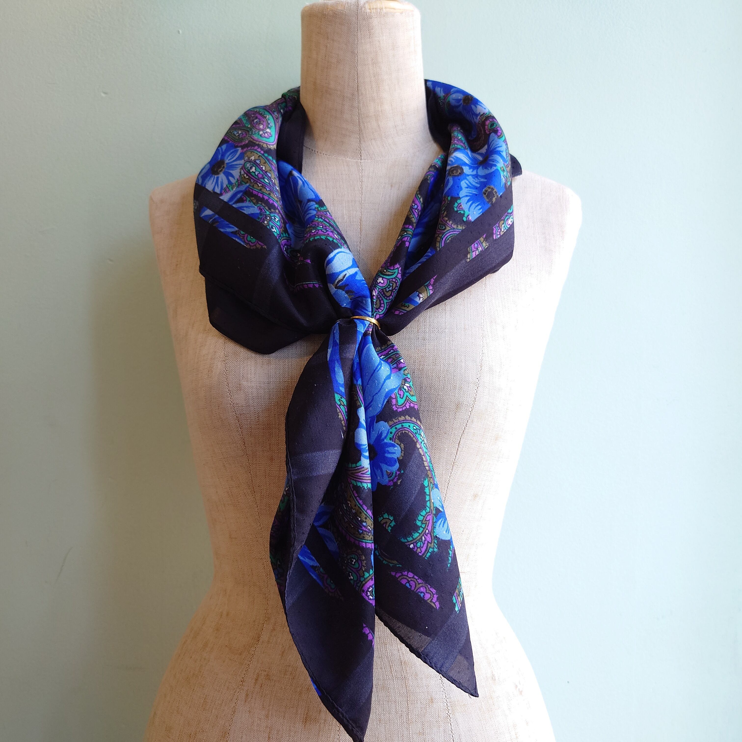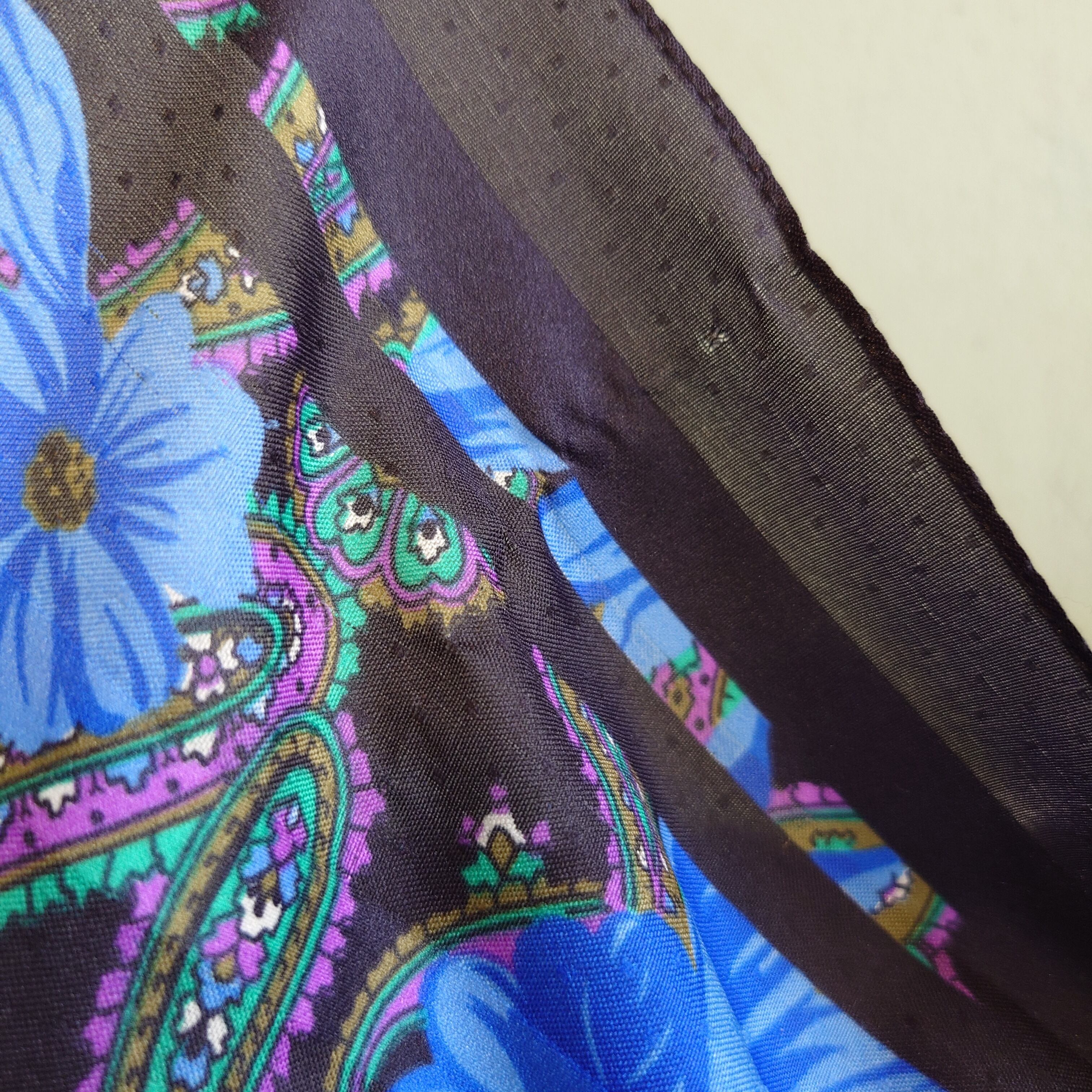 ★黒ベースにペイズリー柄と花柄が美しいヴィンテージスカーフ。細かいドットとストライプ柄もいれられていて、身につけたときの動き感も絶妙。