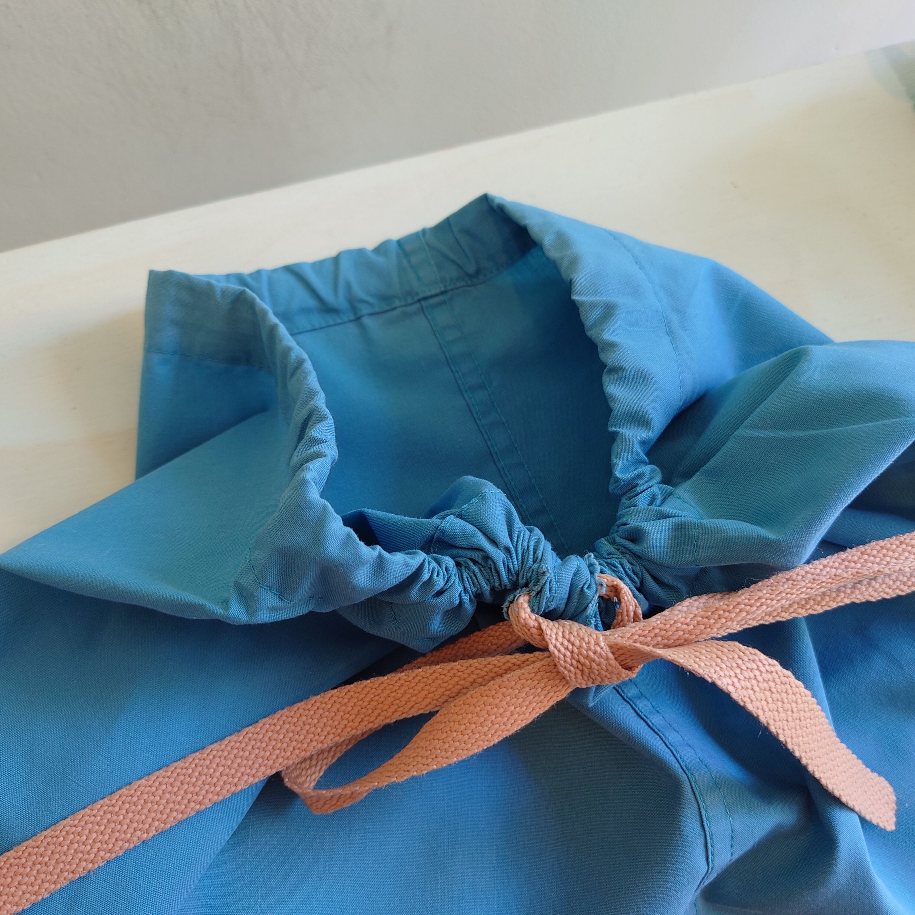 ★ターコイズに近い独特な青緑色に、ベージュの紐のアクセントがかわいいスクラブのイージーパンツ。ストンと太めなシルエット、スクラブらしい涼しさで夏のリラックスコーデにもおすすめ。ウエストは紐で絞り込めるので、細い方や女性もダボッと履けます。