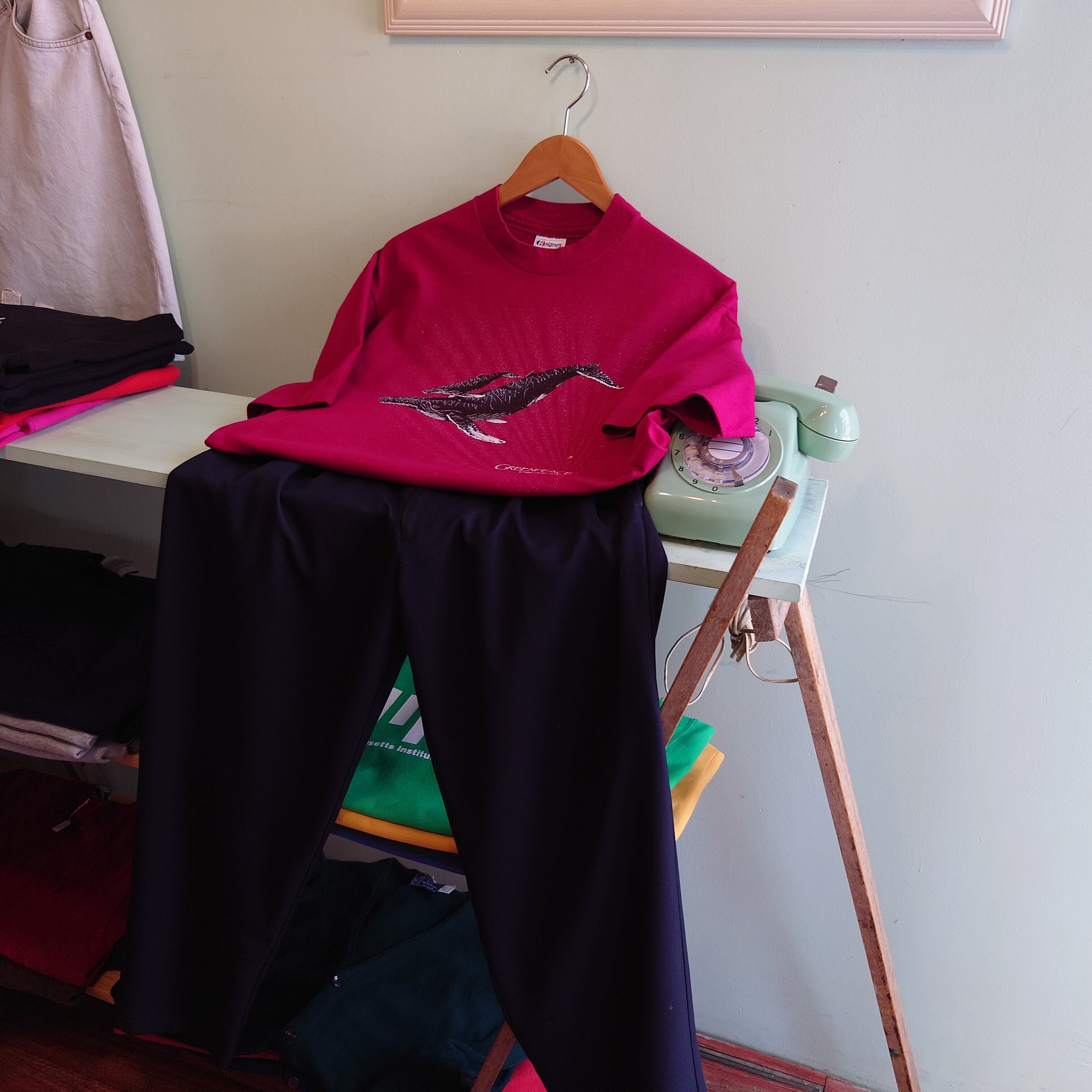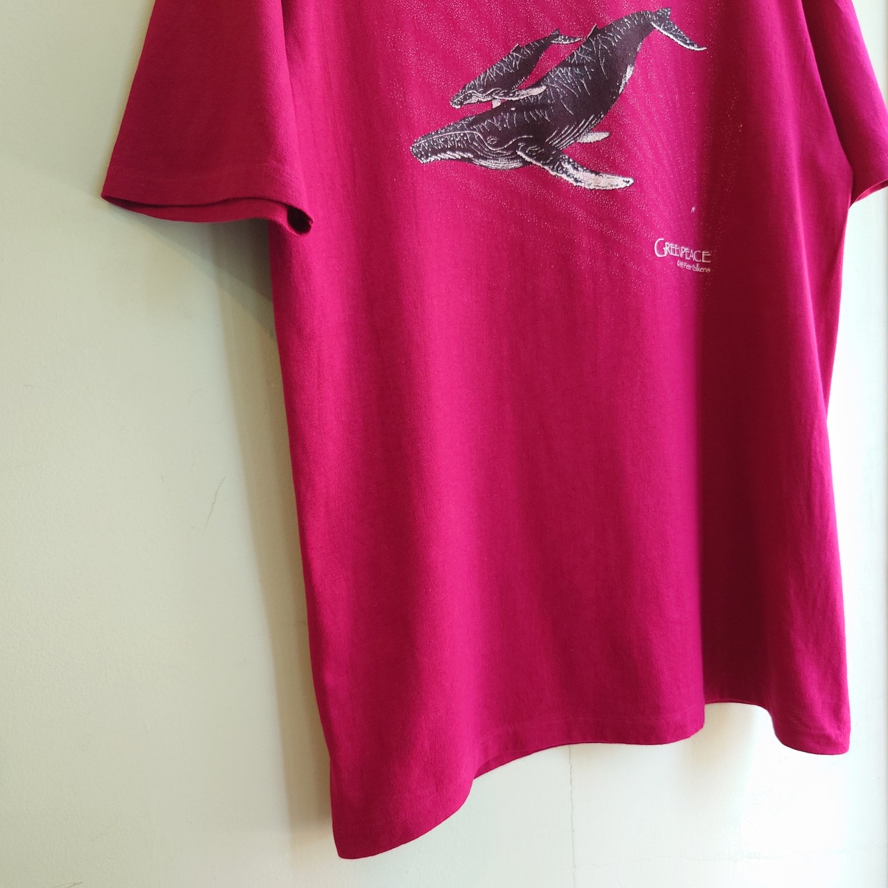 ★米国に実在する環境保護団体"グリーンピースUSA"のヴィンテージTシャツ。レアカラー、マゼンタ色にザトウクジラの親子をモチーフにしたクラシックでハートウォーミングな1枚。