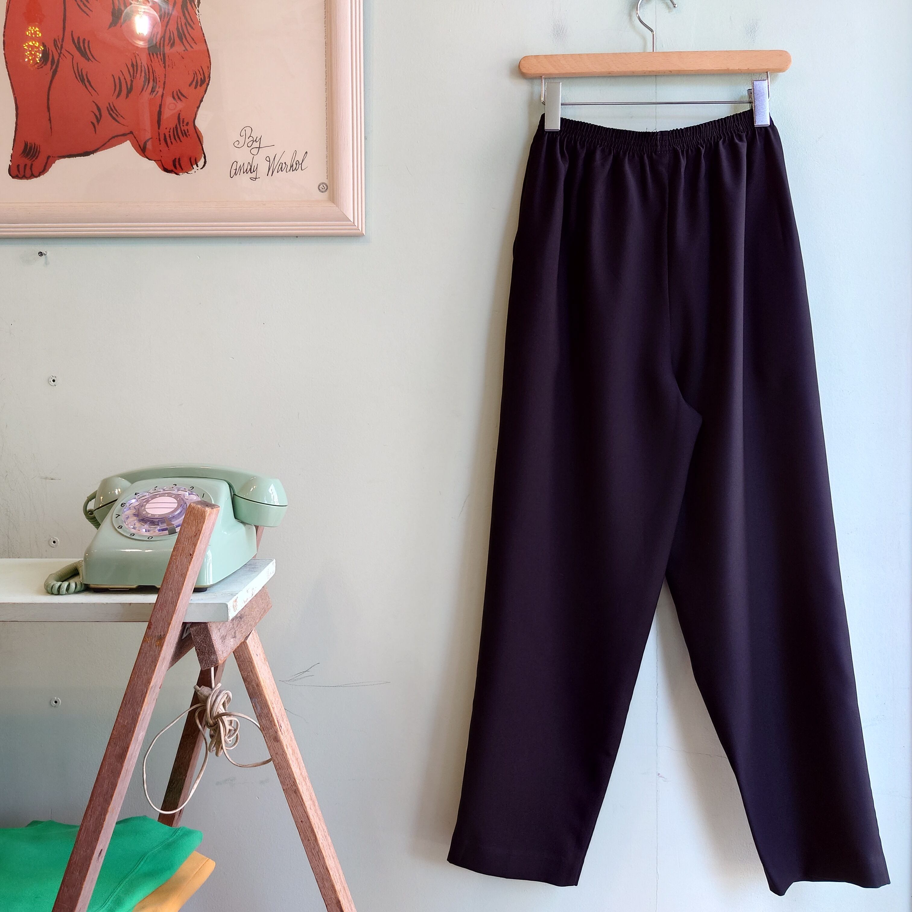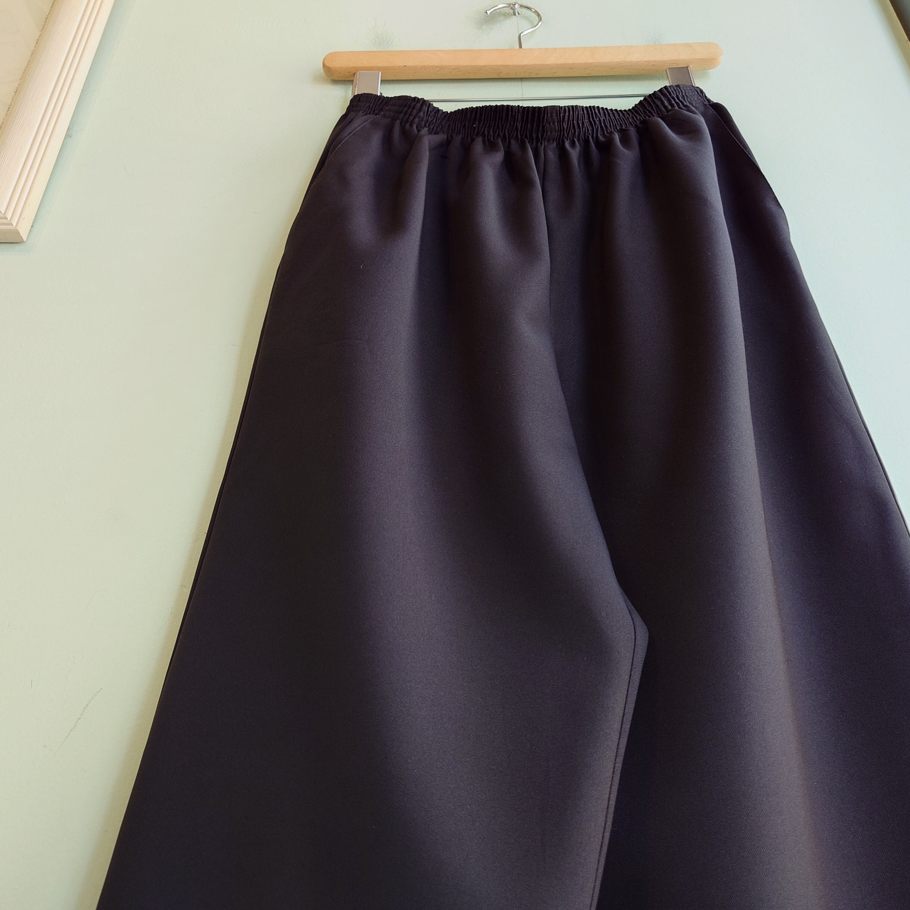★80svintageのイージースラックス、使えるブラック。古めな時代ならではの強いテーパードのカーブで、ダボッとかわいいシルエットがおすすめポイント。ウエストゴムのイージーさはありながら、合わせれば光沢でしっかり大人っぽいのもいい。