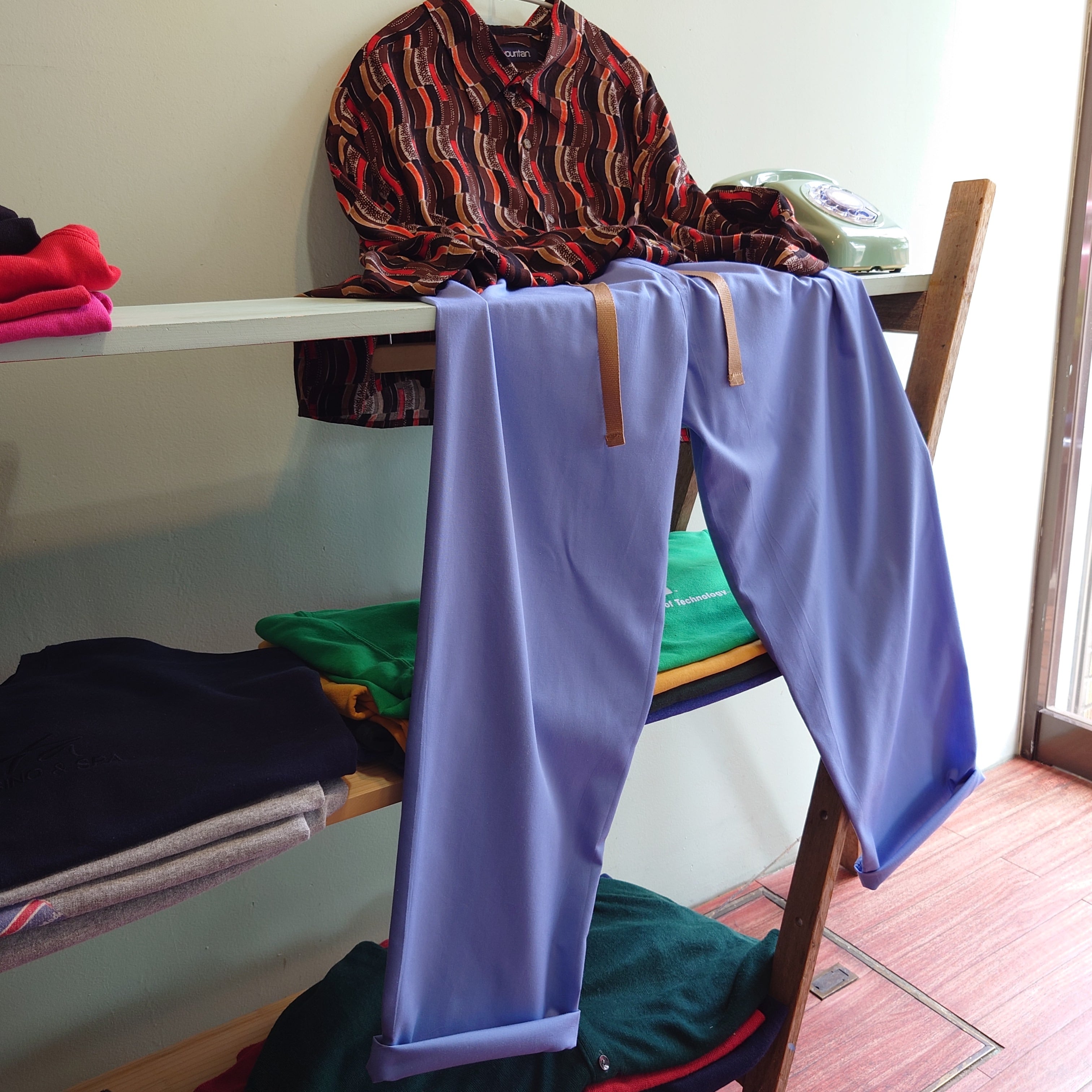 ★アクア系カラーの爽やかさに、ベージュの紐がピリッとアクセントになったドクターパンツ。ストンと太めなシルエットを、イージーパンツ感覚で絞って涼しく履ける一本。Tシャツと合わせればよりラフ、意外にシャツにも相性良し。