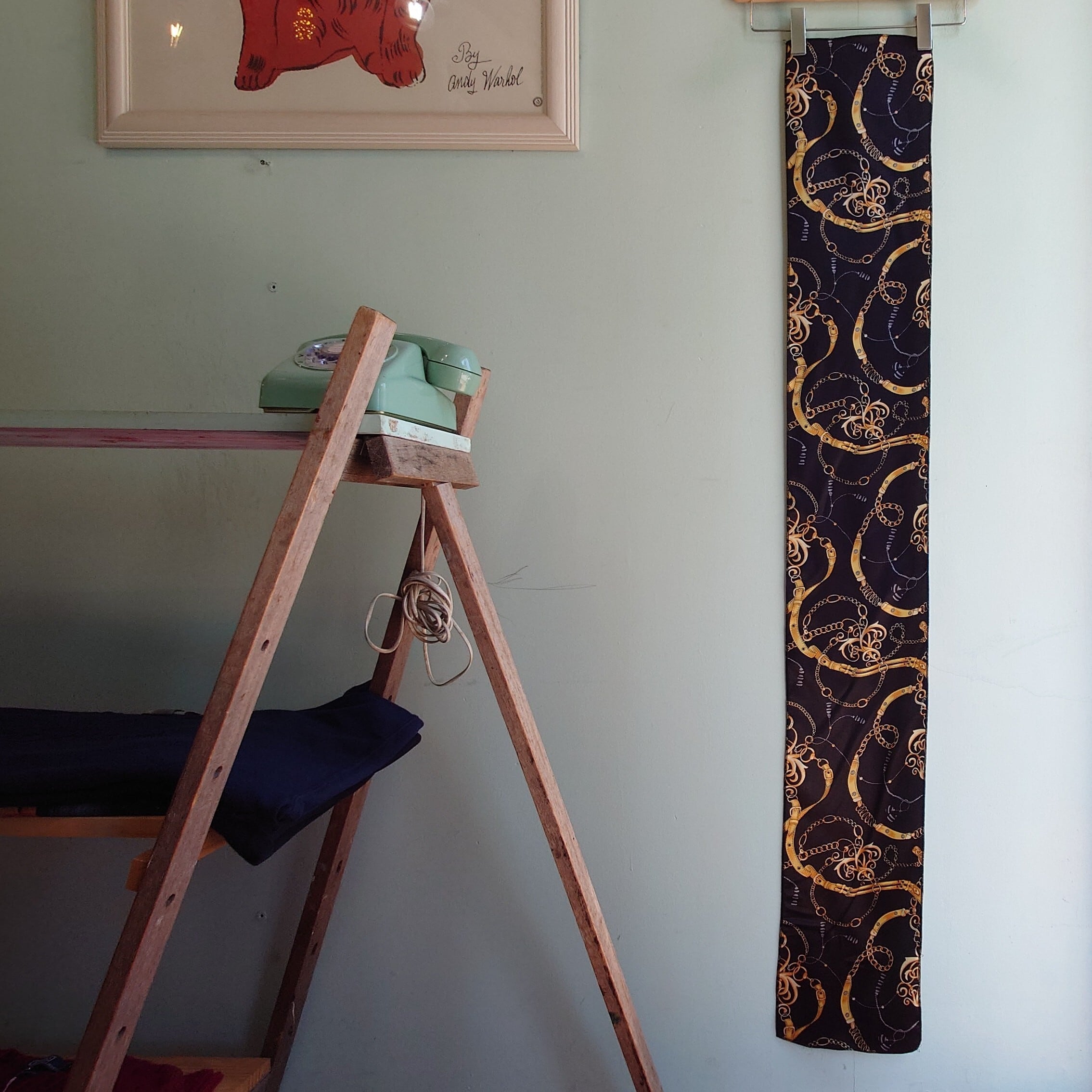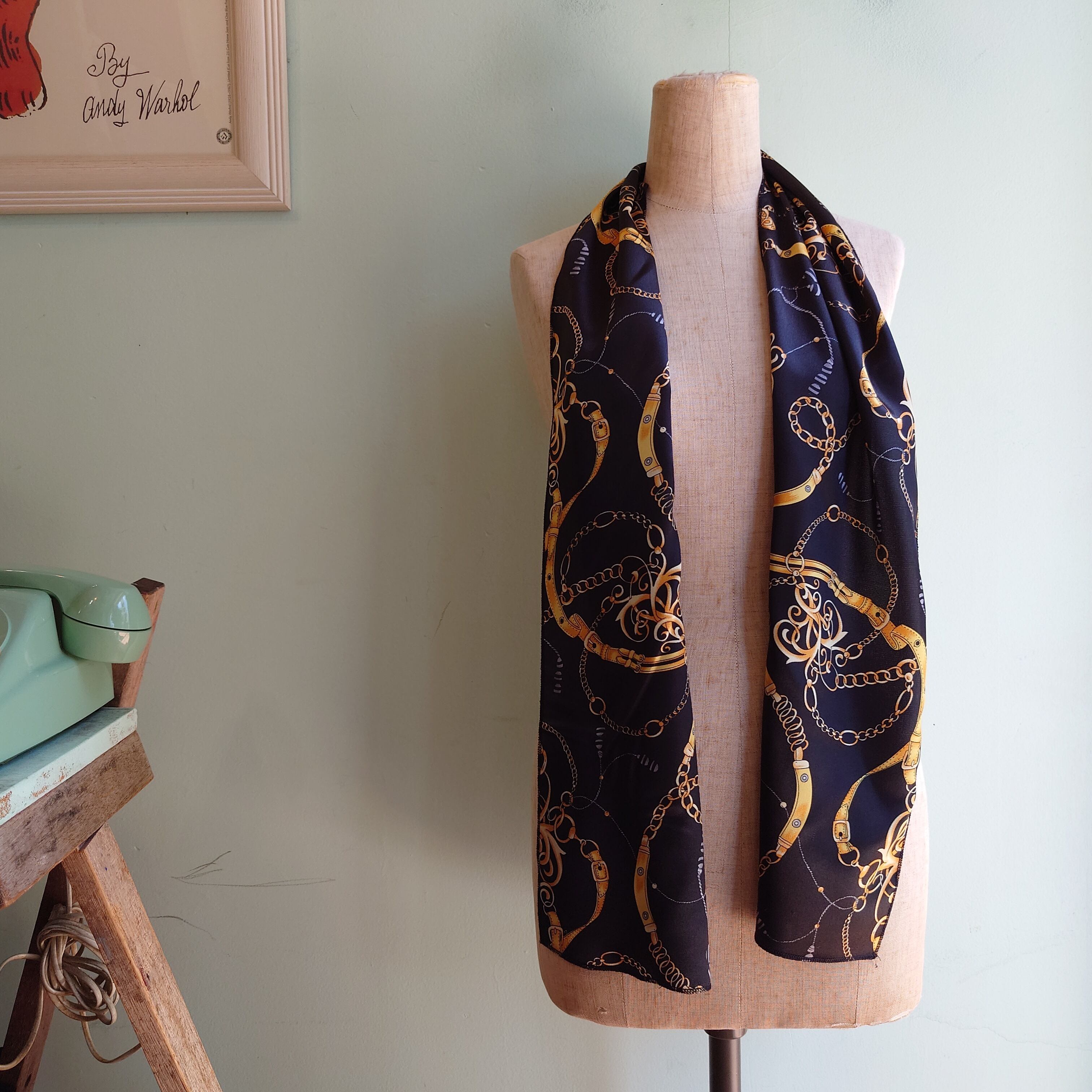 ★黒地にゴールドの総柄がドレッシーなマフラータイプのヴィンテージスカーフ。スクエアなタイプとは違うスッキリしたシルエットで、絞ったときのシルエットがきれいなのがいい。