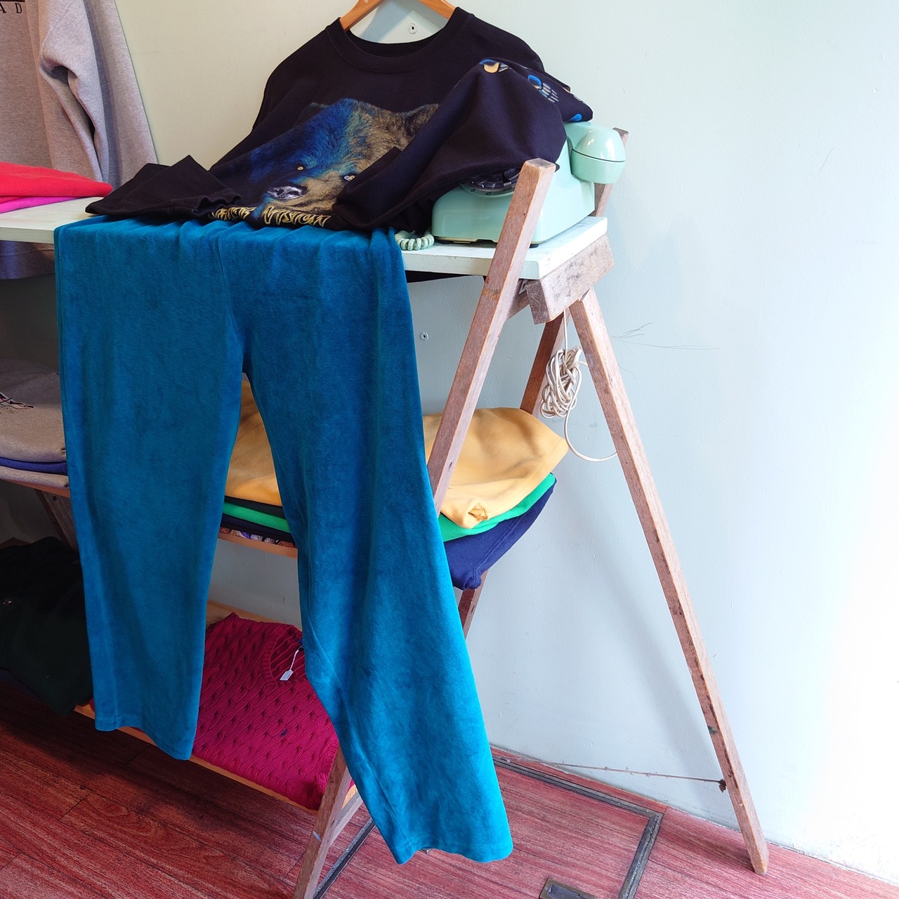 ★ブルーグリーン色のオールドベロアパンツ。通常の素材とはまるで違うベルベットな毛並、光沢感でコーデの中にギャップを作れる一本。レトロなテーパードシルエットもかわいい。
