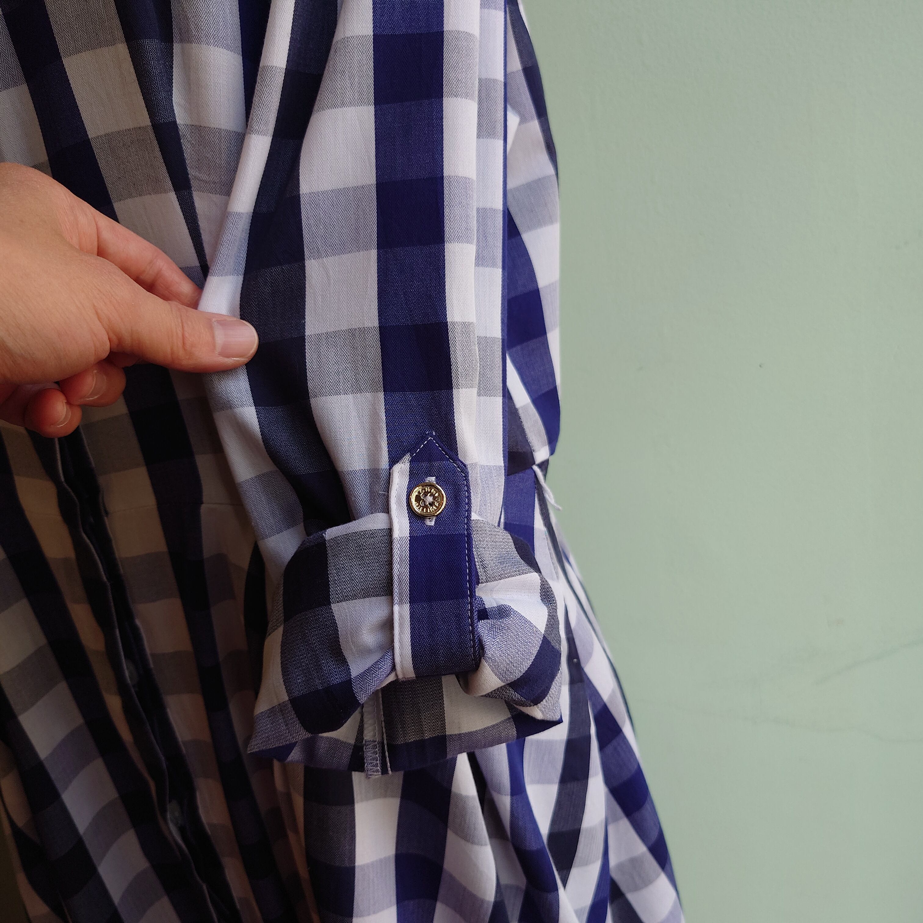 TOMMY HILFIGER チェックワンピース チェック ロールアップドレス フライフロント ロールアップ袖 青白