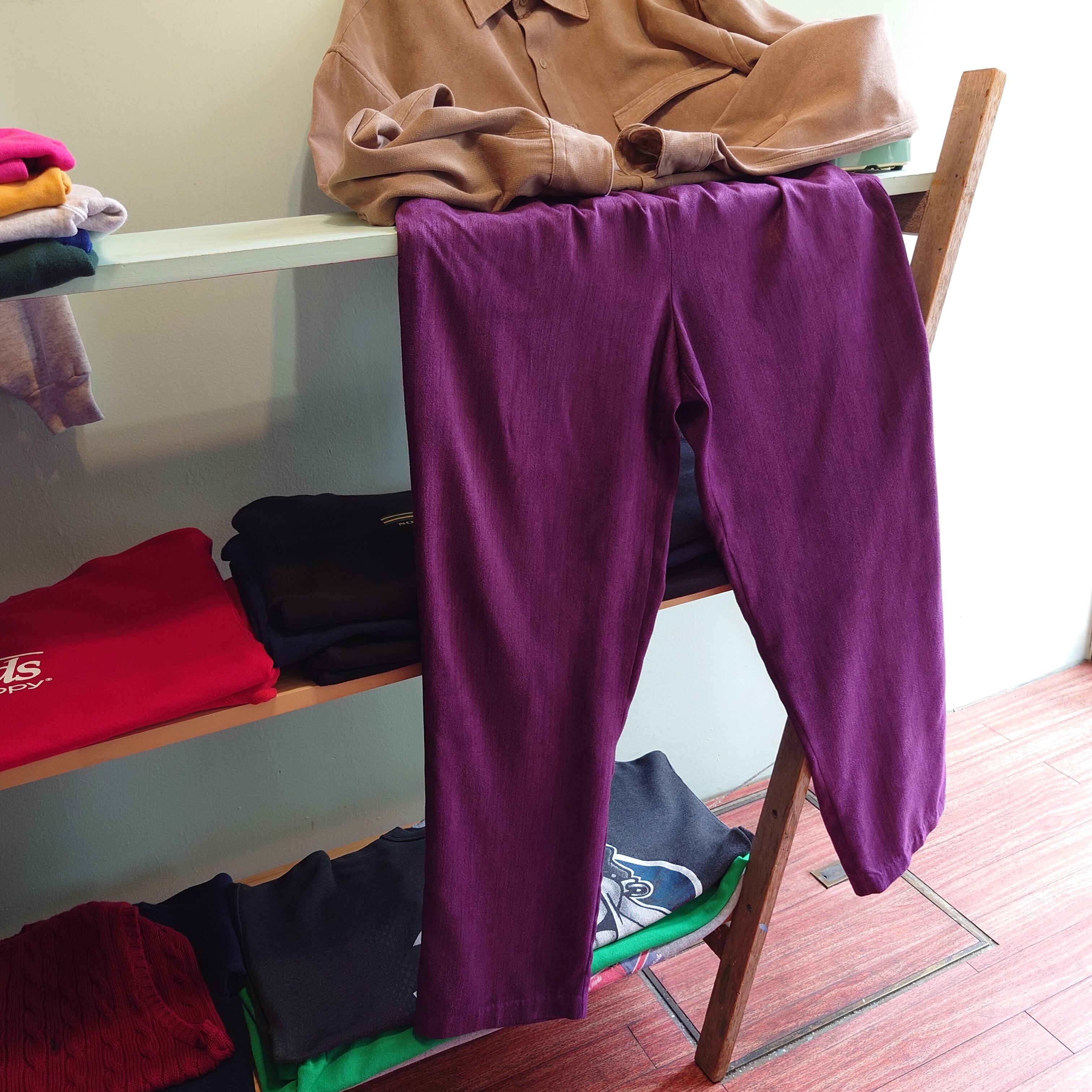 ★レアカラー、グレープに加えて、フェイクスウェード素材が面白いイージースラックス。ベロアの様なファー感と、独特な光沢感、色の変化が面白い。おなじみのテーパードシルエットも異素材感と色味で秋冬らしい雰囲気に。