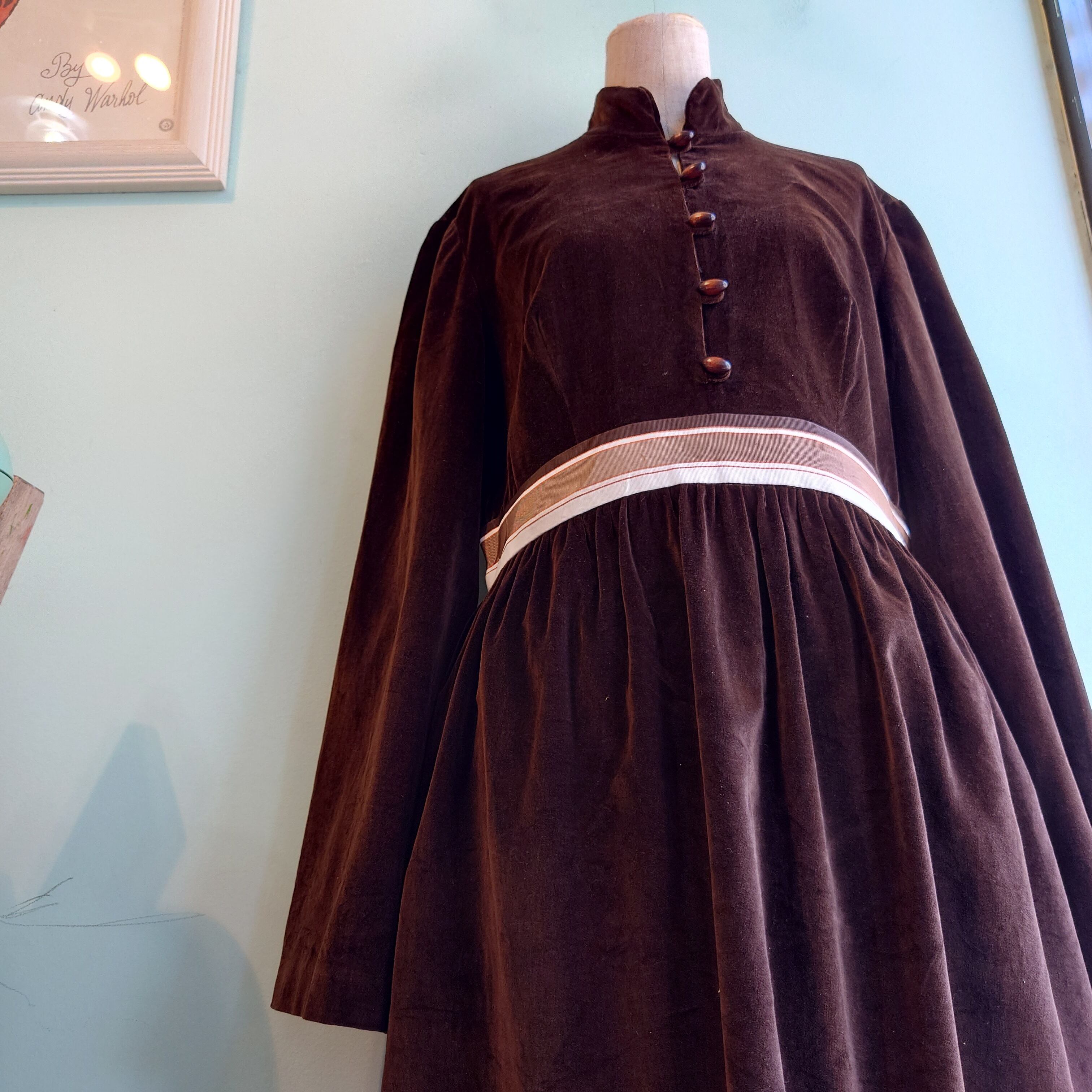 ★チロリアンなフロントと、ファーライクなベロアの毛並みに惹かれるヴィンテージドレス。チャイナライクなフロントにはどんぐりのようなボタンつき。全体的にチョコレートカラーで合わせられた、ナチュラルな雰囲気も素晴らしい。ボトムと合わせたり、ブーツと合わせたりするのに似合う絶妙な丈感です。