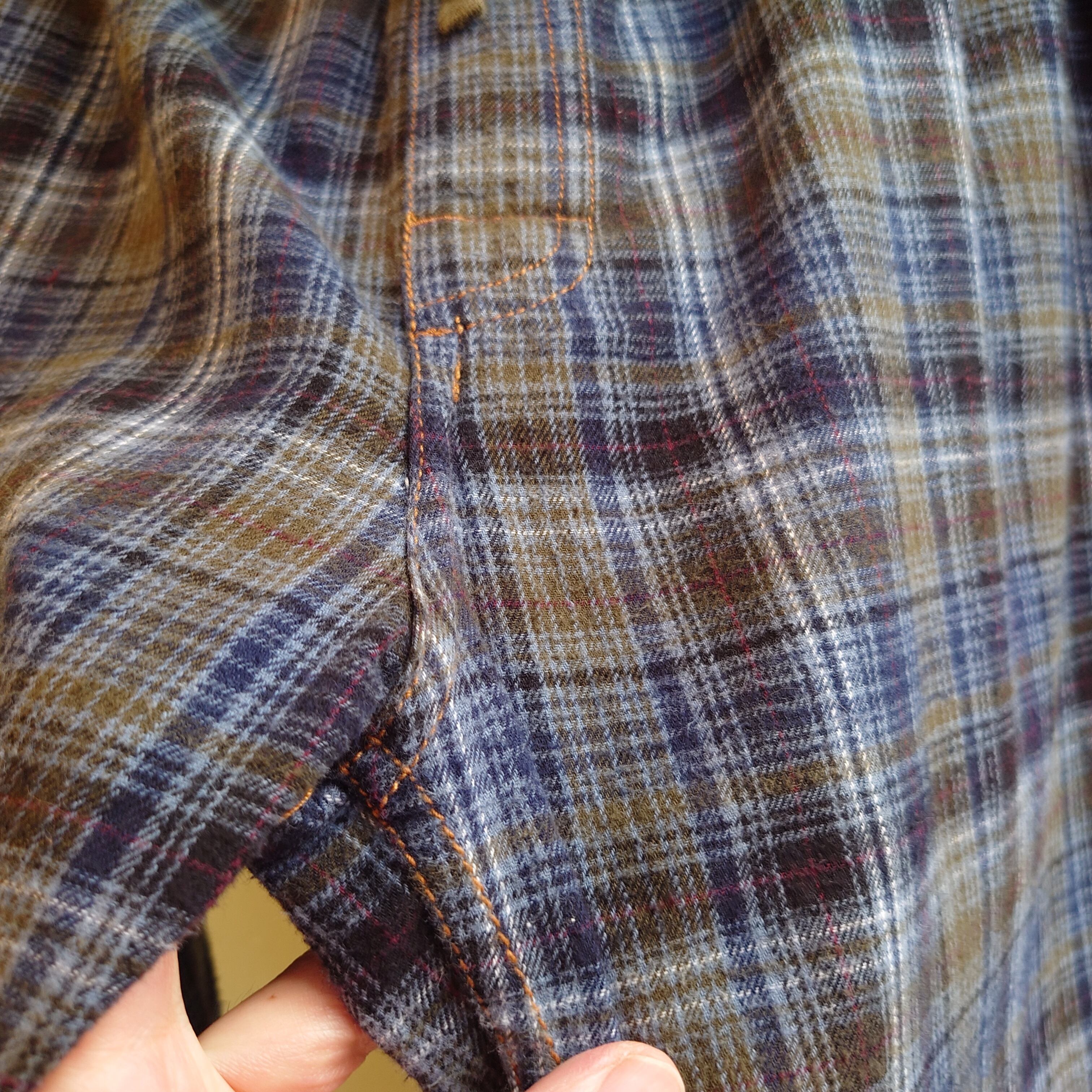 ★リーバイスらしいアイデンティティ、アーキュエットステッチとレッドタブ、オレンジのステッチがレアなパジャマパンツ。青系をベースに、落ち着いた色の混ざり方もこだわりあり。普通のパジャマパンツよりもややしっかりした生地感。
