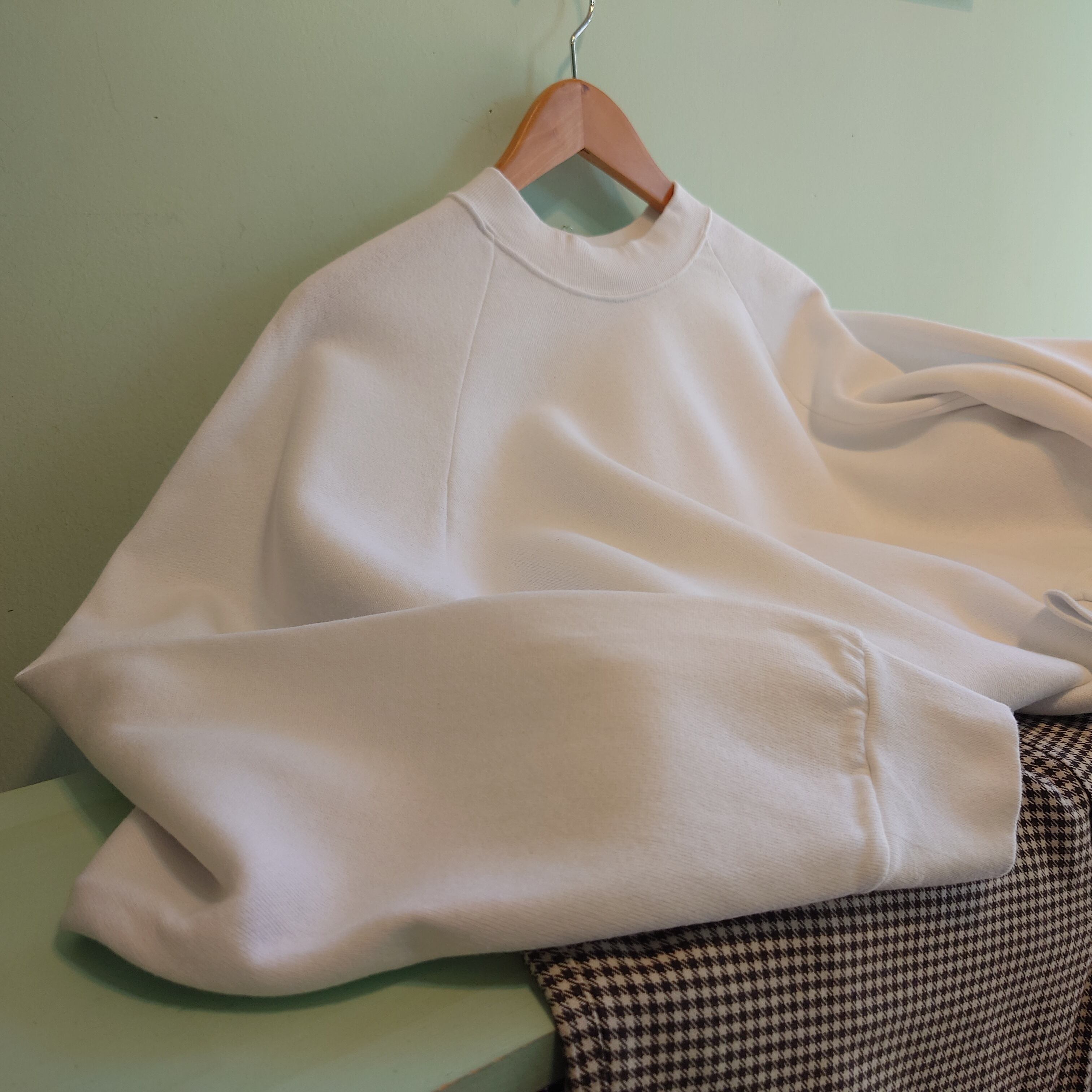 ★フレッシュなホワイトと、レトロなラグランスリーブシルエットに惹かれるフルーツの無地スウェット。ラグランならではの肩落ち感で、ワイドながらスッキリしたシルエットが◯。全体的に漂うユニセックスな雰囲気も良し。