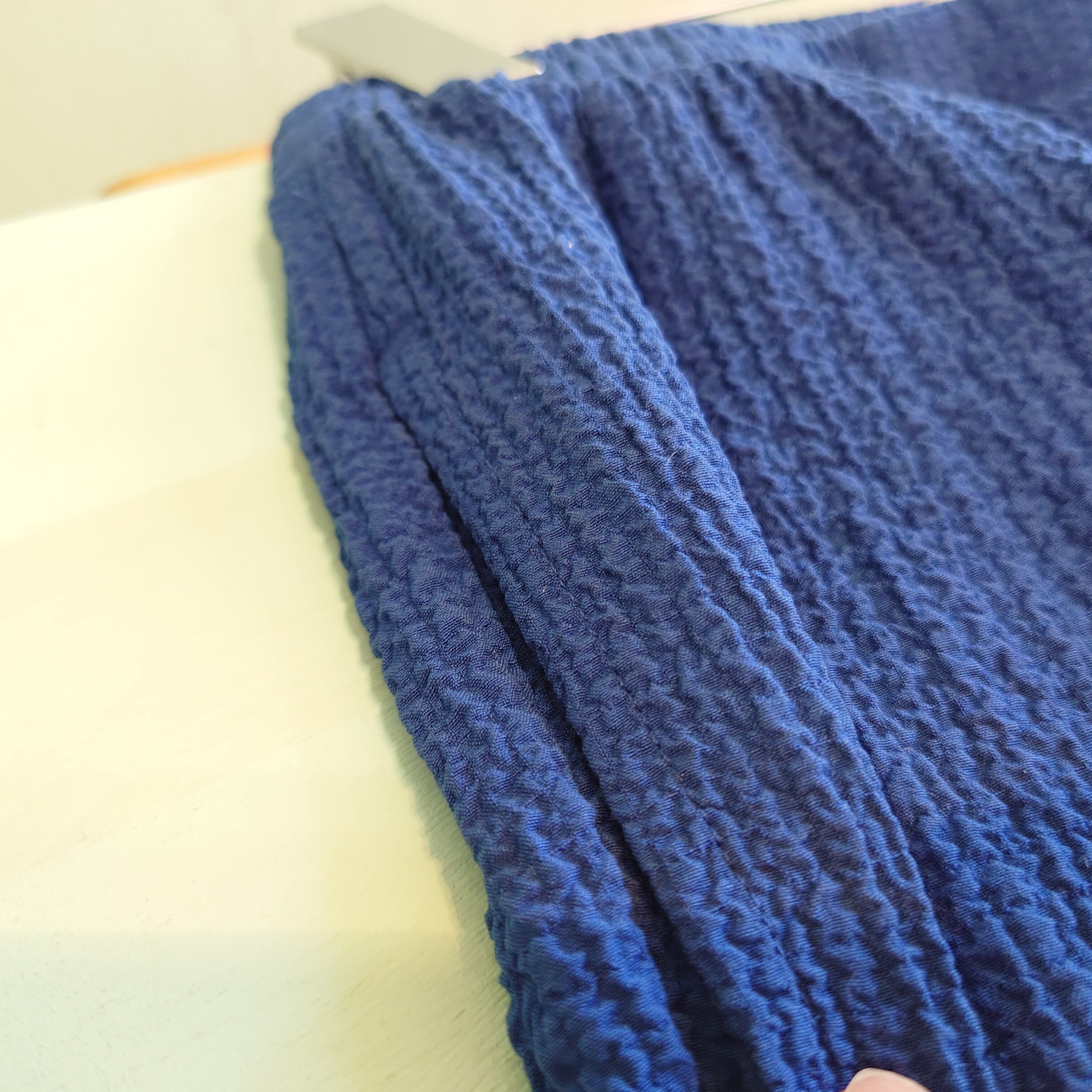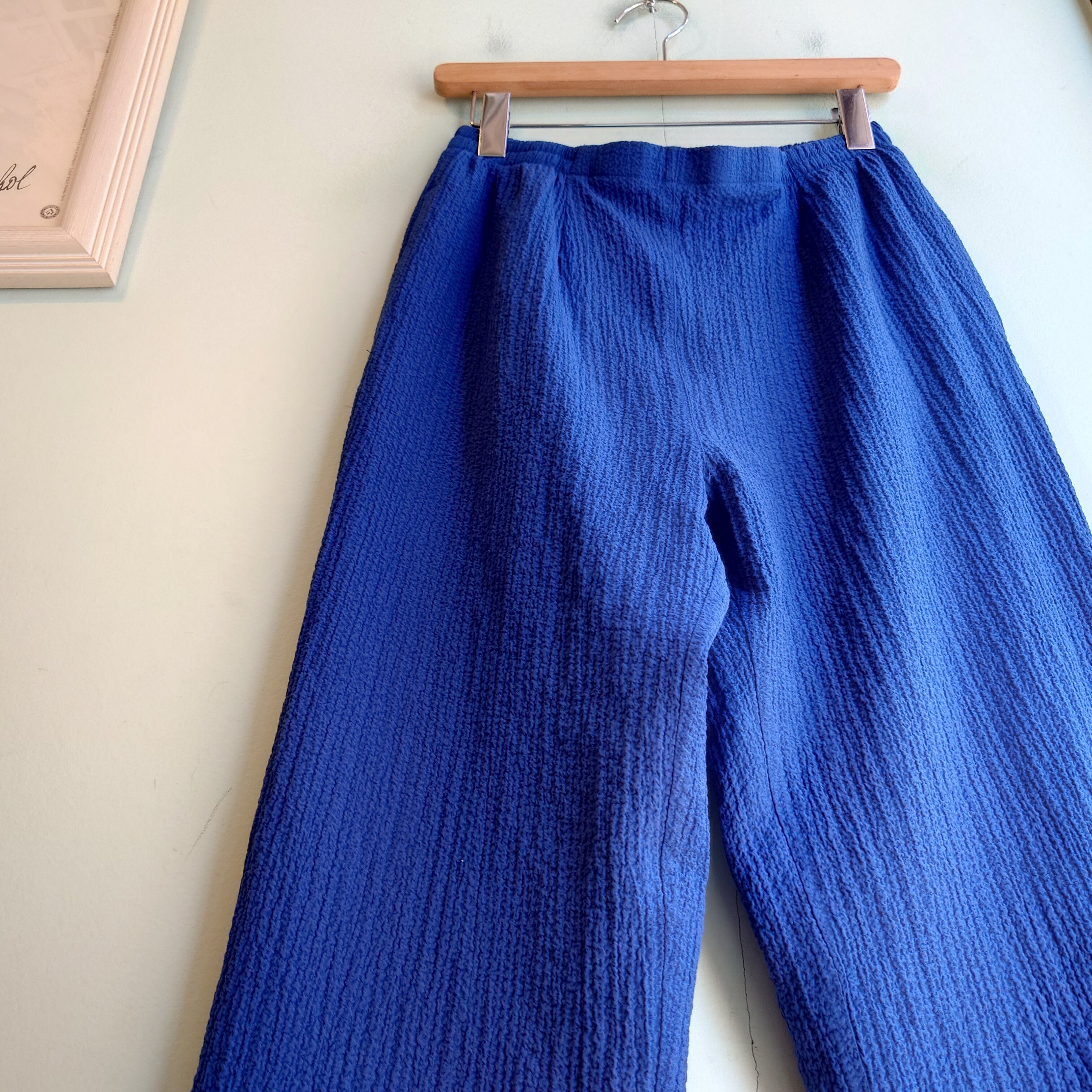 ★絞り加工の凸凹感が可愛い変わり種イージースラックス。寒色のフレッシュさとユニセックスな雰囲気が面白い。ややボリューム感のあるテーパードでトップスも選ばない。合わせやすく存在感のあるボトムです。