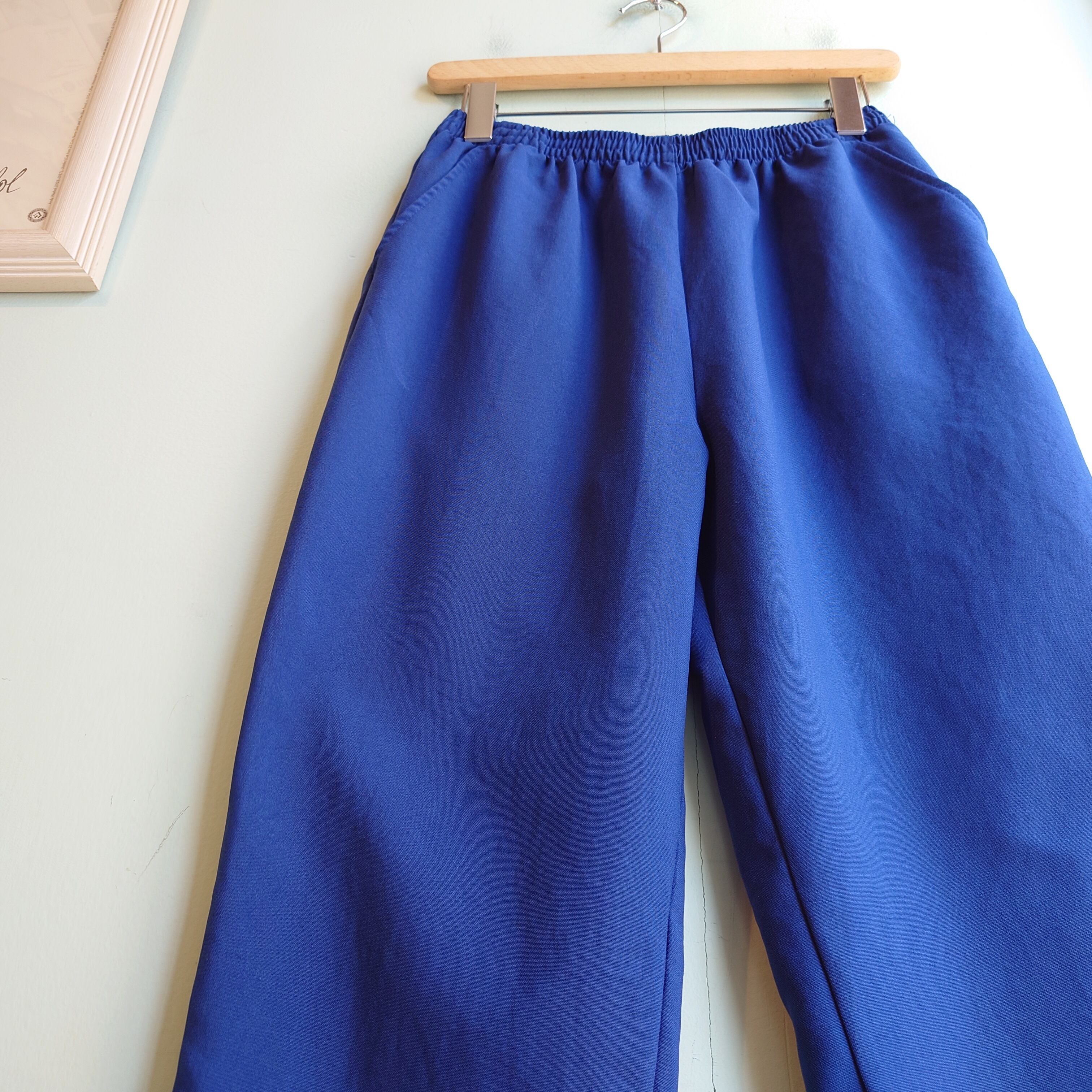 ★コロンとした丸みのあるテーパードシルエットと、履けば意外な大人っぽさで使えるイージースラックス。ネイビーよりも少し明るい紺と、ポリにガーゼのような軽さをプラスしたさりげないレアタイプ。