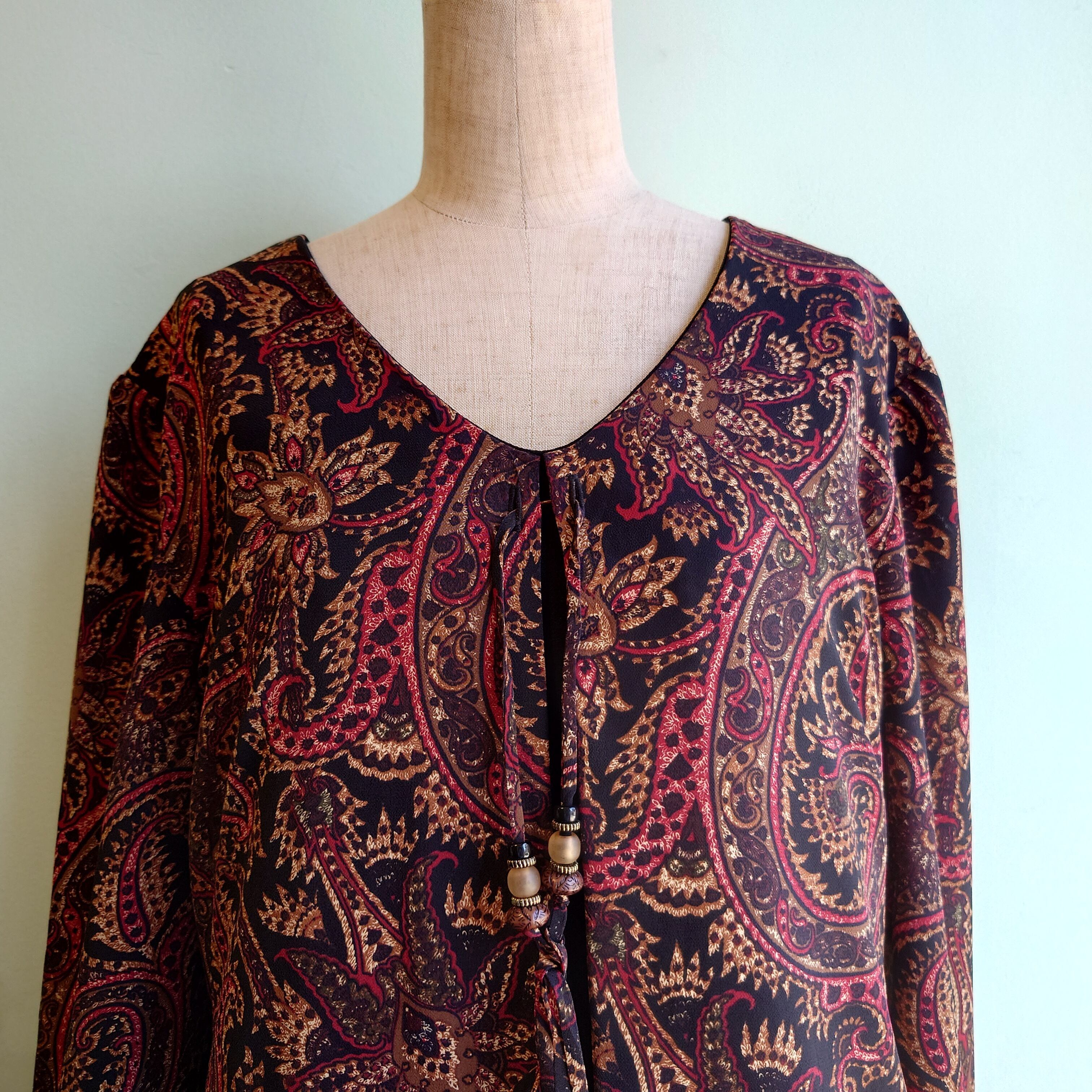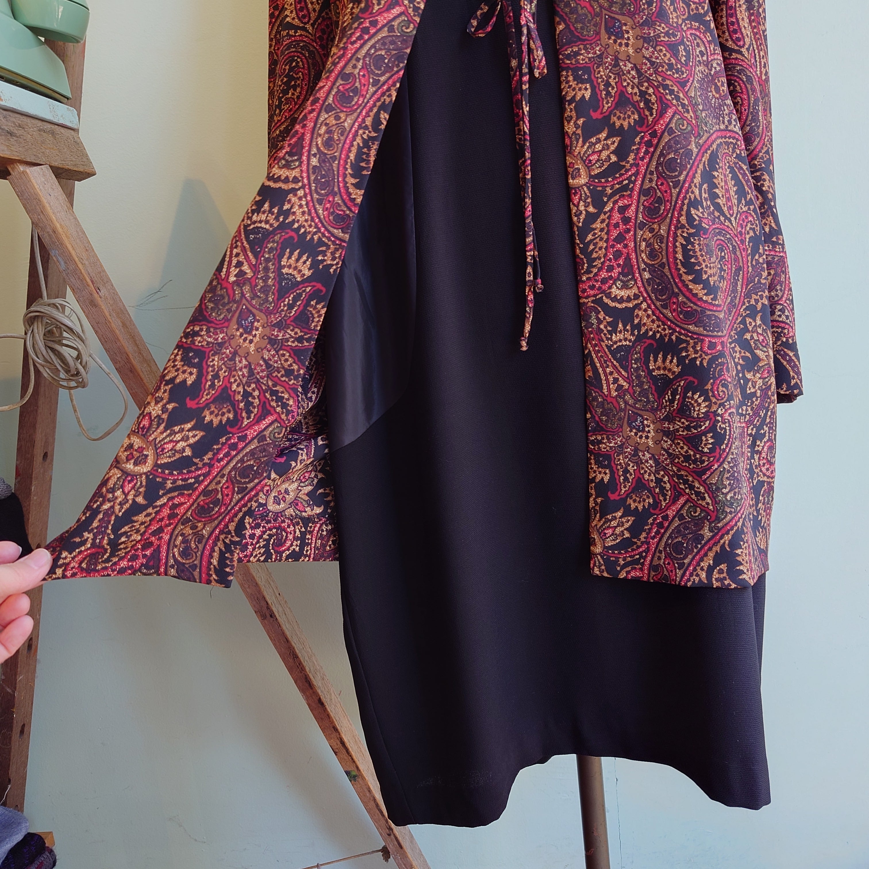 テロっとした生地感がひらひらかわいい、アンサンブル系のヴィンテージドレス。ペイズリーのカーディガンを羽織るようなデザインで、ネックレスのような紐もアクセントに。ドレッシーさの中にエスニックな香りがいい具合にプラスされた素敵な1枚。
