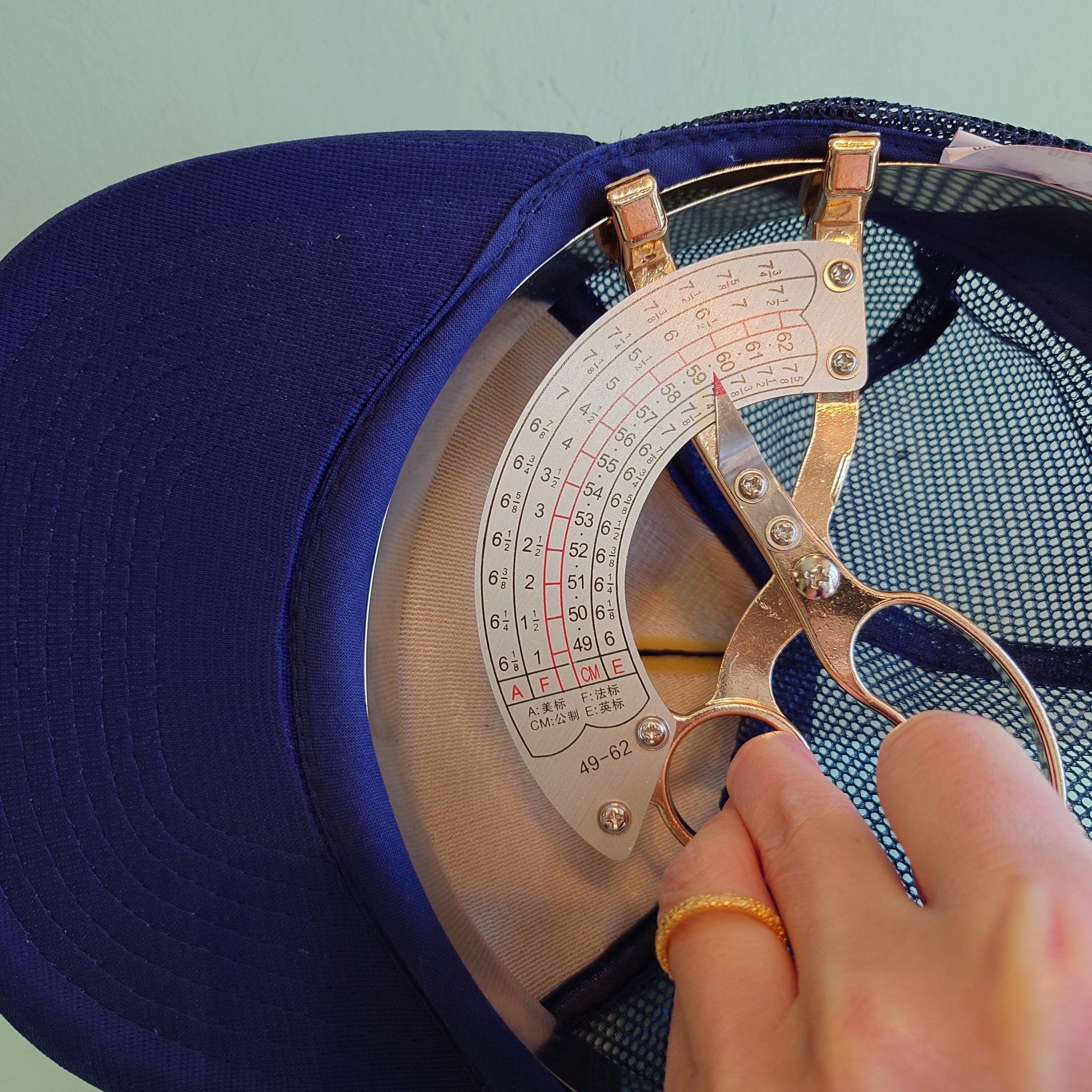 キャップゲージを使って内側を採寸しています。